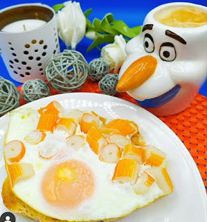 Tostada de pan de espelta integral con avena con huevo a la plancha y 3 palitos de cangrejo (surimi) 0% materia grasa.
