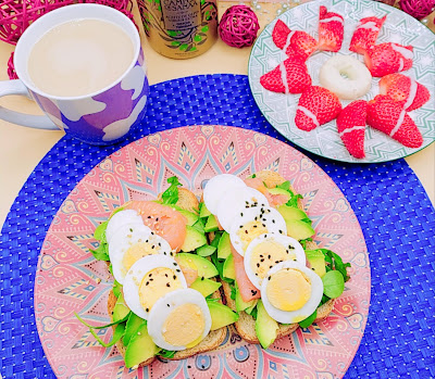2 tostadas de pan de espelta integral con avena con: 15 gramos de rúcula, 30 gr de salmón ahumado bajo en sal, un aguacate, un huevo cocido y unas semillas de sésamo tostado y sésamo negro.