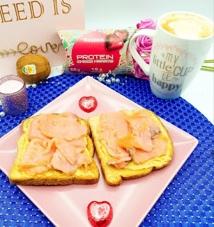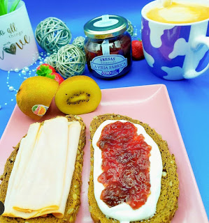 – Otra con queso untable proteico (o yogur natural 0%) y mermelada de frutos rojos artesanal con stevia.