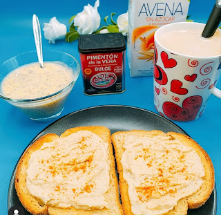 2 tostadas de pan de espelta integral con avena con hummus casero (receta), un huevo cocido y pimentón dulce.