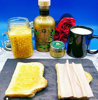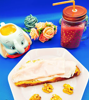 2 tostadas de pan con quinoa con 5 gramos de aceite de oliva virgen extra con jamón cocido de pavo.