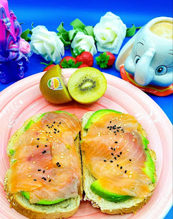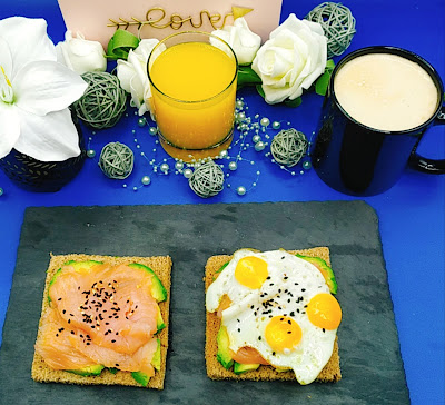 2 tostadas de pan 100% integral sin azúcares añadidos con: 40 gramos de salmón ahumado bajo en sal, un aguacate, 3 huevos de codorniz a la plancha y semillas de sésamo tostado y sésamo negro.
