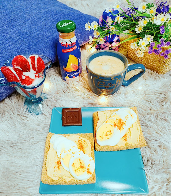 1 tostada de pan de espelta blanco con hummus casero (receta), medio huevo cocido y pimentón dulce.