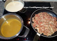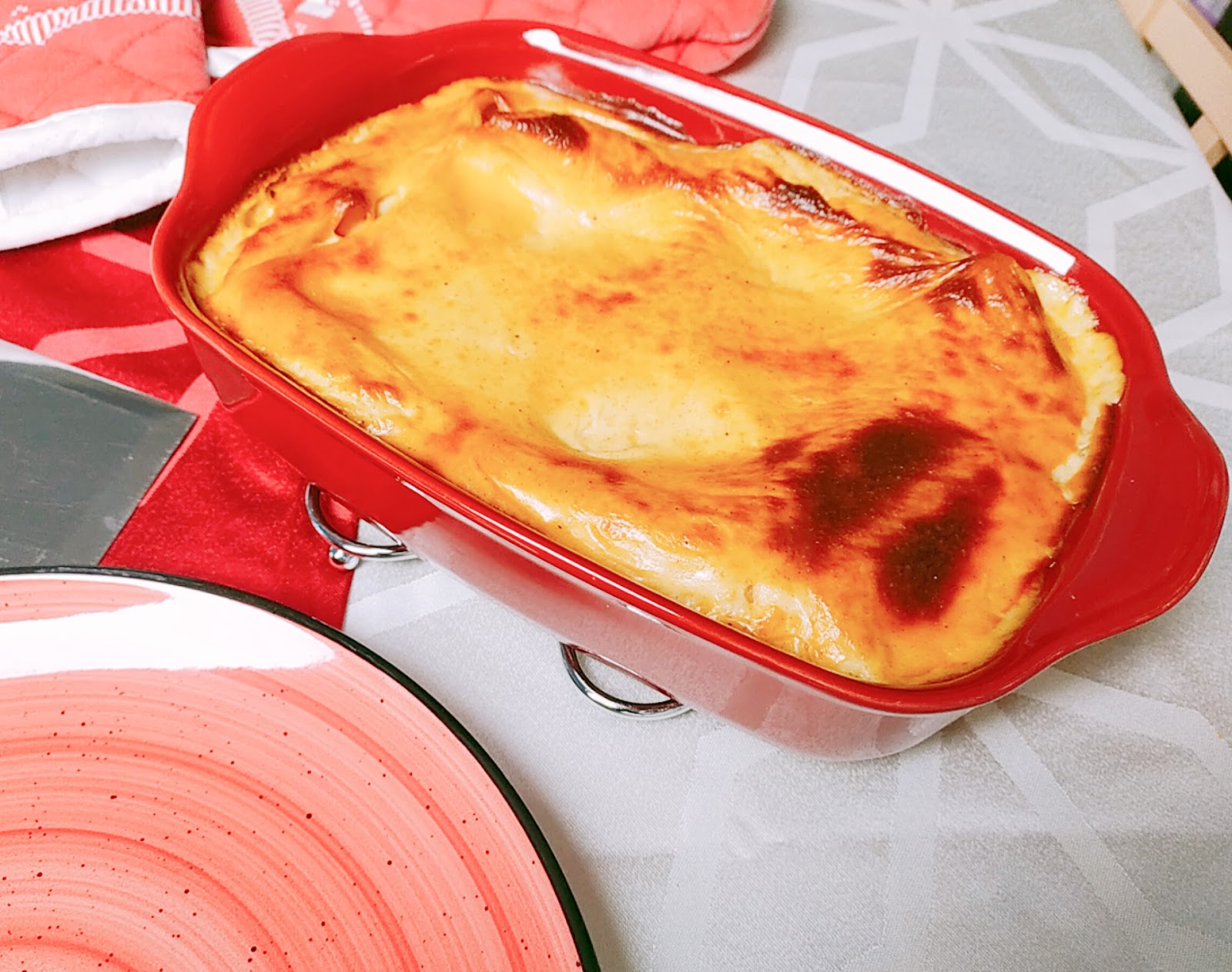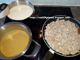 Y ahora llega la parte fácil y creativa. Quitáis la carne del fuego, preparáis la fuente y las cosas. Y a montar la lasaña.