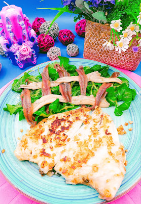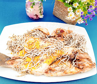 – En una fuente apta para horno, echáis un chorrito o dos pufs si es en spray de aceite de oliva virgen extra, colocáis el pescado encima (lavado), echáis otro chorrito pequeño de aceite, sal rosa, ajo en polvo o picado (en cachitos), pimienta blanca, y podéis echarle también cúrcuma (queda muy rico y ya sabéis que soy una fan incondicional de las especias) y almendra en cachitos (podéis picar un poquito almendras bio), queda espectacular.