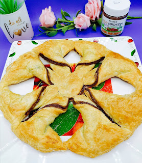 – Preparar todos los ingredientes antes de sacar los hojaldres del frigorífico (el hojaldre caliente es muy difícil de manejar, se vuelve muy pegajoso).– Se pone la primera masa abajo y se pinta con la crema de nocilla dejando un margen de un dedo por cada borde.