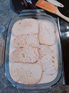 5. Cuando la leche esté caliente y huela a arroz con leche (porque la canela haya impregnado ya la leche) echar sobre las rebanadas de pan cubriéndolas todas.